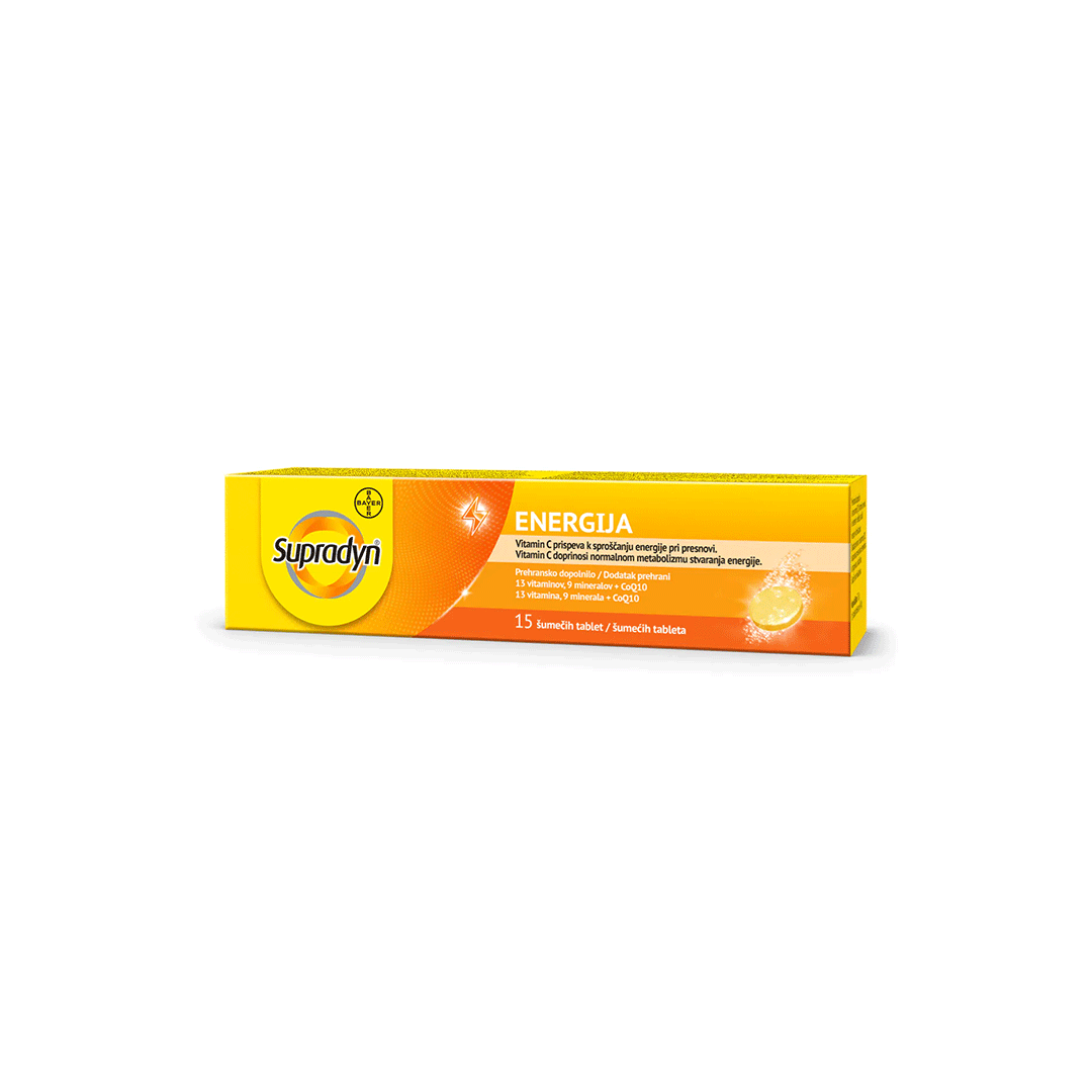 Jedinstvena kombinacija vitamina, minerala i aktivnog sastojka koenzim Q10 u proizvodu Supradyn energija pomoći će vam obnoviti zalihe energije u vašem tijelu kada ih najviše trebate. Osmišljen posebno za ljude koji imaju aktivan i dinamičan stil života i koji trebaju puno energije tokom cijelog dana. Osjećaj bezvoljnosti često je znak manjka energije. Supradyn energija djeluje u skladu s vašim tijelom i pomaže vam u dopuni novom energijom. Tako ćete opet biti u punoj snazi bez osjećaja iscrpljenosti.